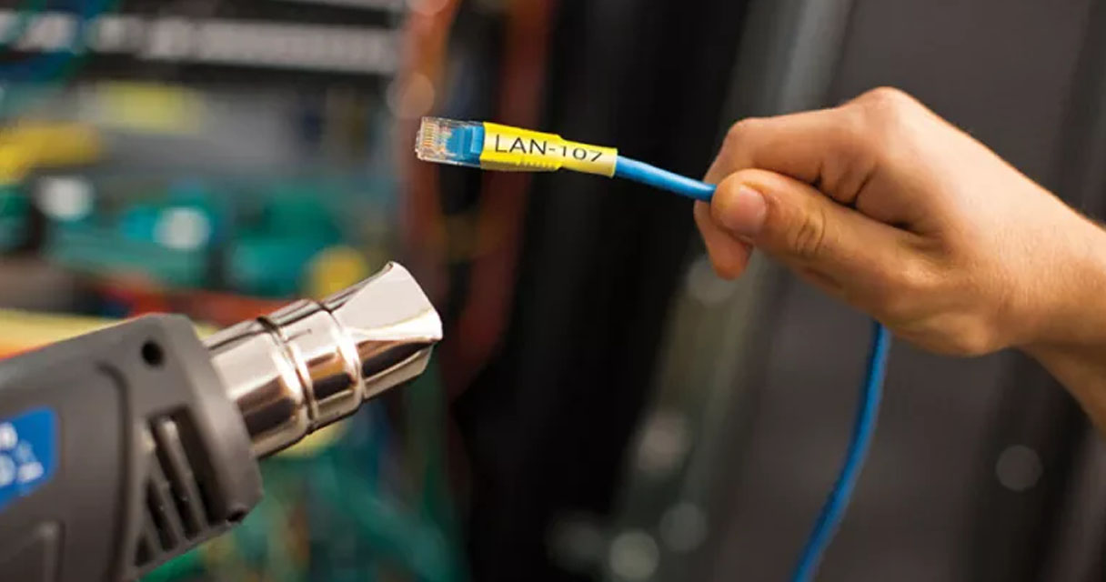 O material é um pequeno tubo flexível que, após a impressão do rótulo, é encaixado no fio. Com o uso de um soprador térmico, ele se retrai, aderindo ao cabo. O resultado?